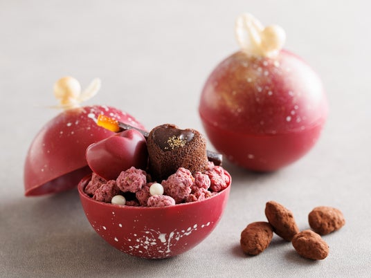 艶やかなルビーレッドが目を引く球体状のチョコレートは、プリンセスの宝石箱をイメージ。本年はホワイトチョコレートで作った天使の羽根と真珠をあしらい、開ける前から期待感が高まるデザインに仕上げました。