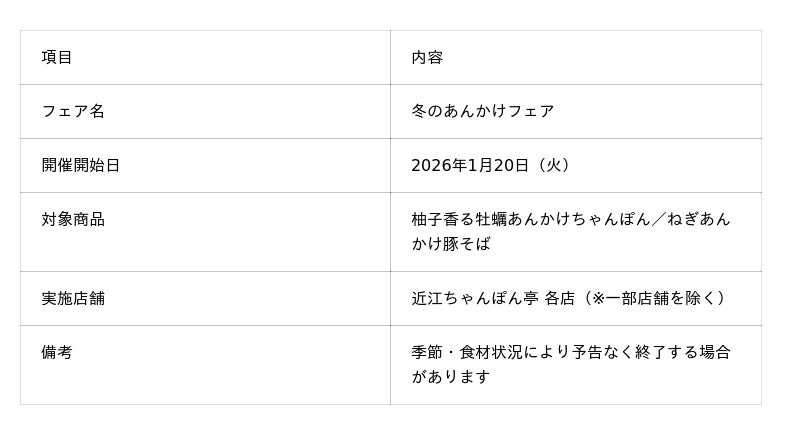 「近江ちゃんぽんをニッポンのちゃんぽんに!」を掲げるドリームフーズ株式会社(本社:滋賀県彦根市/代表取締役社長:山本英柱)が展開する滋賀県発のご当地ちゃんぽん専門店「近江ちゃんぽん亭」は、2026年1月20日(火)より、季節限定企画「冬のあんかけフェア」を開催いたします。