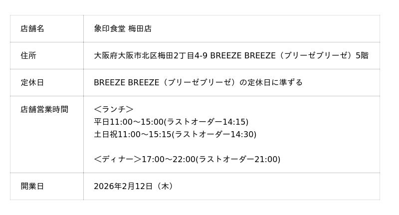 象印マホービン株式会社では、全国3店舗目として、大阪・梅田のBREEZE BREEZE(ブリーゼブリーゼ)5階に、「象印食堂 梅田店」を2026年2月12日(木)に出店します。