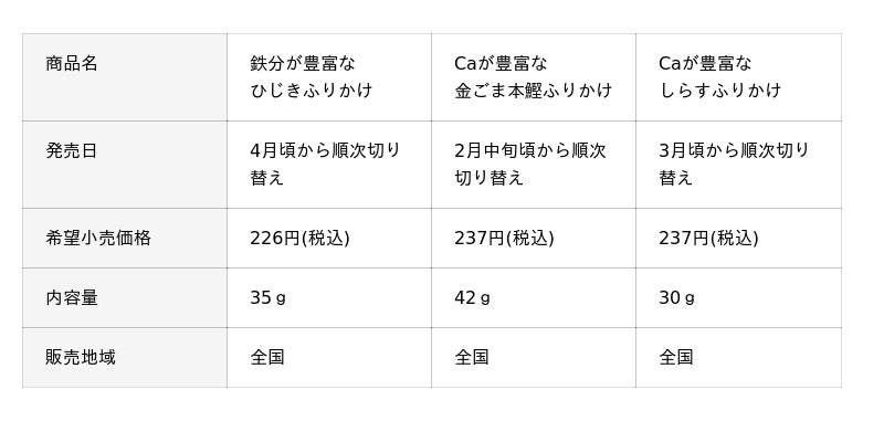のりやごま、ふりかけ、お茶漬けの素などの製造、販売を行う株式会社浜乙女(本社:名古屋市中村区、代表取締役社長:服部義博)は、発売20年以上のロングセラー商品の「鉄分が豊富なひじきふりかけ」、「Caが豊富な金ごま本鰹ふりかけ」、「Caが豊富なしらすふりかけ」を刷新し、2月中旬より全国で順次出荷いたします。