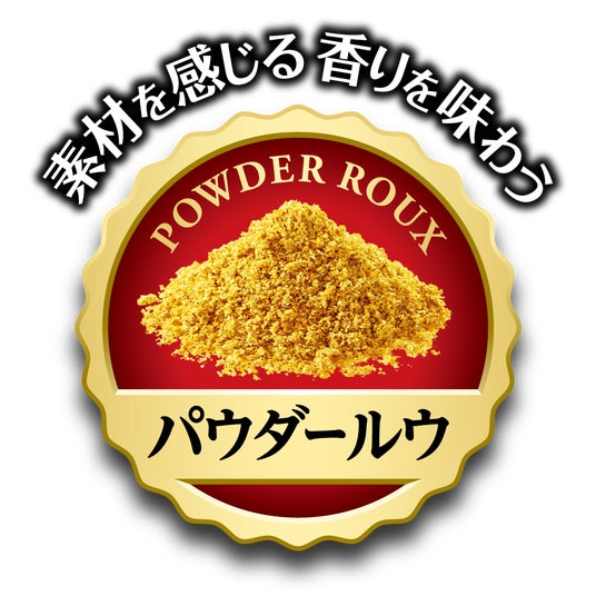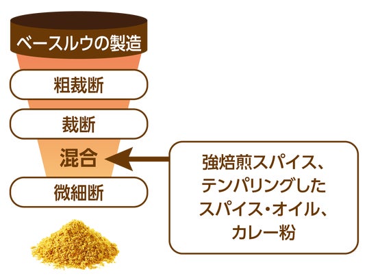 熱をかけるとおいしくなる素材でベースのルウを製造し、それを粗く裁断。その後、熱をかけない方がおいしい素材を加えながら、細かく裁断しパウダーにします。固形のルウに比べ、油脂や小麦粉の使用が控えめであるため、