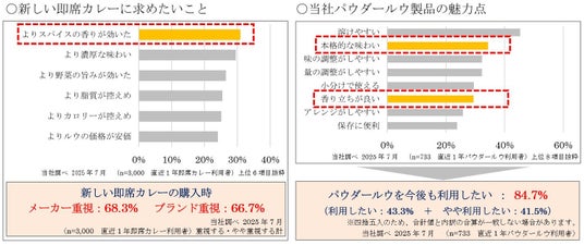 ・新しい即席カレーに求められるスパイスの香り新しい即席カレーに対しては、スパイスの香りが効いた味わいを求める方が最も多く、その購入の決め手としてメーカーやブランドが重視されています。