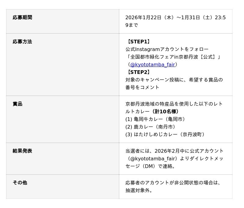 第43回全国都市緑化フェアin京都丹波実行委員会(会長:桂川孝裕・亀岡市長)は、2026年9月18日より52日間に開催する日本最大級の花と緑のイベント「京都丹波みどりの里まつり(第43回全国都市緑化フェアin京都丹波)」(以下、みどりの里まつり)の認知拡大を図るため、2026年1月22日(木)の「カレーの日」にあわせ、公式Instagramのフォロワー限定のキャンペーンを実施いたします。