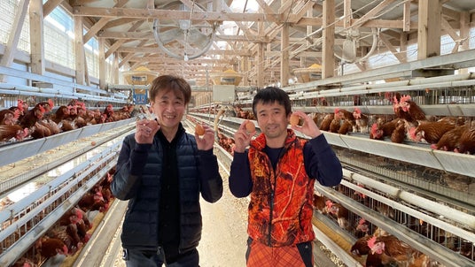 坂本養鶏に卵を引き取りに。坂本養鶏の坂本さん(右)とサンクトガーレンの岩本(左)