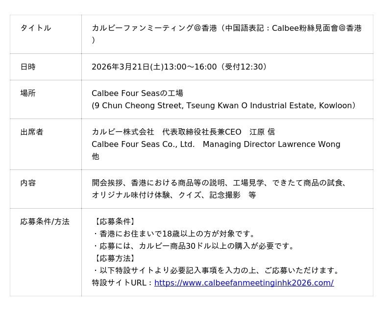 カルビー株式会社(本社:東京都千代田区、代表取締役社長兼CEO:江原 信)と、香港のグループ会社・Calbee Four Seas Co., Ltd.はカルビーグループとして初めて海外でのファンミーティングを開催します。本イベントは、2026年3月21日(土)に香港の工場で行われ、工場見学やできたて商品の試食、味付け体験などを通じて、現地のファンの方々との交流を深めます。