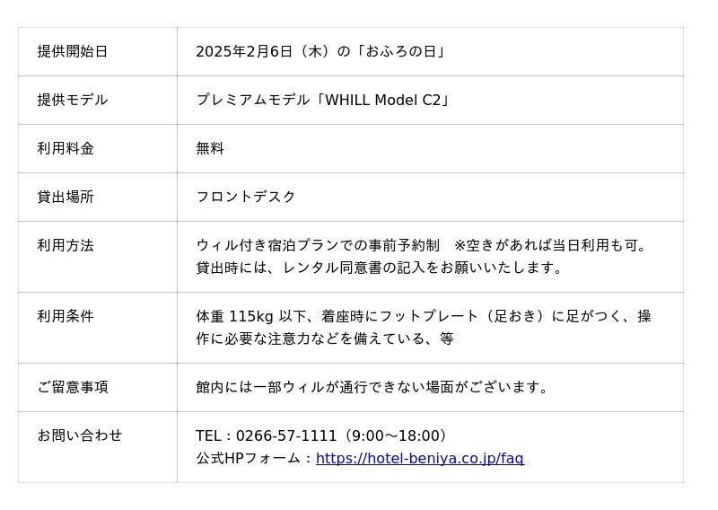 株式会社ホテル紅や(所在:長野県諏訪市、代表者:栗原等、以下「ホテル紅や」)と松本日産自動車株式会社(本社:長野県松本市、代表取締役社長:長澤拓真、以下「松本日産」)は、ホテル紅やにおいて2026年2月6日(金)の「おふろの日」より、WHILL株式会社(以下「WHILL社」)が開発する免許不要の近距離モビリティWHILL(ウィル)の館内外の移動用にレンタルできるサービスが提供開始されることを発表いたします。高齢化や多様化、インバウンド需要増の加速などを背景に、あらゆる方を迎え入れるインクルーシブな滞在環境を整備強化する一環です。宿泊業界とモビリティ業界の本異業種連携を通じ、アクセシビリティ(移動のしやすさ)の観点からも、誰もが安心快適にお楽しみいただけるひとときを提案いたします。