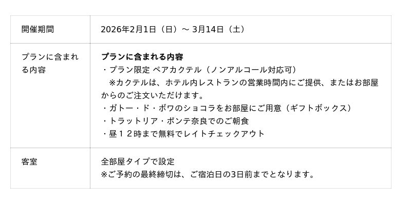ノボテル奈良(所在地:奈良県奈良市)は、2026年2月1日(日)~ 3月14日(土)の期間限定で、カップルやご夫婦、ご友人同士でのご利用に最適な「バレンタイン&ホワイトデー宿泊プラン」を販売いたします。