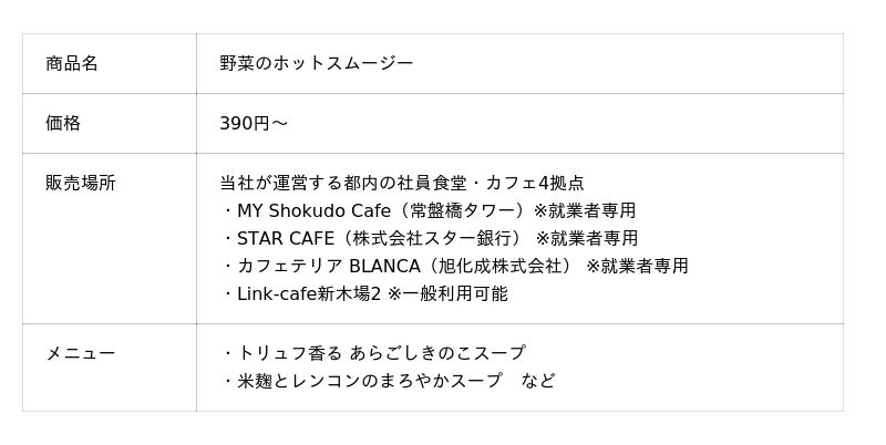 “おいしい一皿で絆をつなぐ”社員食堂・ケータリングの企画運営を行うボンディッシュ株式会社(本社:東京都千代田区、代表取締役:上形 秀一郎)では、「食生活を改善したいが、忙しくて時間が取れない」というオフィスワーカーのニーズに応え、運営する都内の社員食堂・カフェ 4拠点で手軽かつ満足感の高い「ホットスムージー」の提供を強化しています。