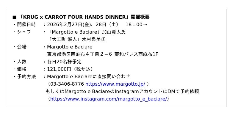 シャンパーニュメゾン クリュッグは、クリュッグ アンバサダーシェフ「Margotto e Baciare」の加山賢太氏、そして「大工町 鮨人」の木村泉美氏とともに、単一食材プログラム「KRUG × CARROT」をテーマにした限定イベント「KRUG × CARROT FOUR HANDS DINNER」を、2月27日(金)、28日(土)に開催いたします。