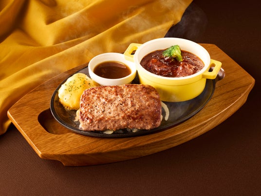「ビーフハンバーグステーキ&ココスの濃厚ビーフシチュー」は、ココスで人気の「ビーフハンバーグステーキ」とマデラ酒が香る濃厚ビーフシチューを一緒にお召し上がりいただける欲張りなメニューです。付け合わせにはコクのあるチェダーチーズをトッピングしたマッシュポテトを添えました。