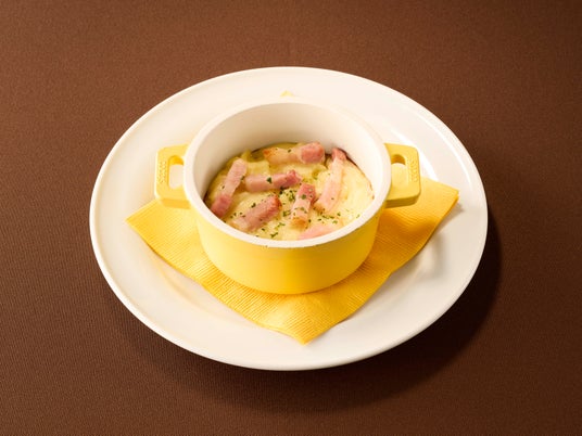 チーズを合わせたマッシュポテトにスティックベーコンをトッピングし、オーブンで焼き上げた一品です。
