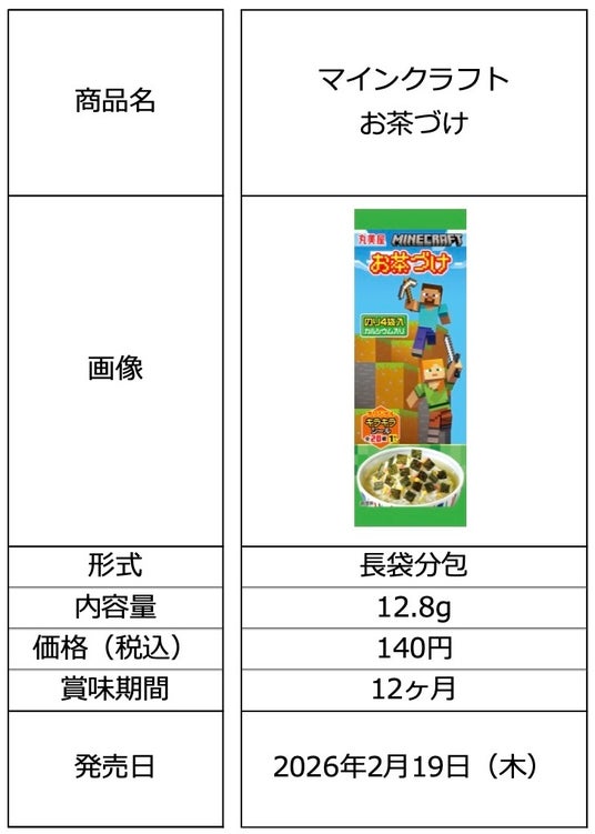 丸美屋食品工業株式会社(本社:東京都杉並区、社長:阿部豊太郎)は、世界で最も売れたゲームの一つで、日本でも大人気の「マインクラフト」を採用した「マインクラフト お茶づけ」を2026年2月19日(木)から新発売いたします。