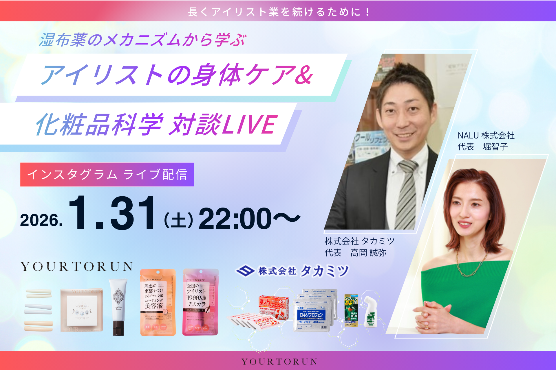 NALU株式会社 代表取締役・堀智子は、湿布薬の製造・販売を行う株式会社タカミツの代表取締役・高岡誠弥 氏をゲストに迎え、アイリスト(まつ毛技術者)特有の身体の悩みに特化したインスタグラムコラボLIVE「~湿布薬のメカニズムから学ぶ~アイリスト身体ケア&化粧品科学 対談LIVE」を、2026年1月31日(土)22:00より 堀智子 公式インスタグラム(@un_tomos)にて実施いたします。