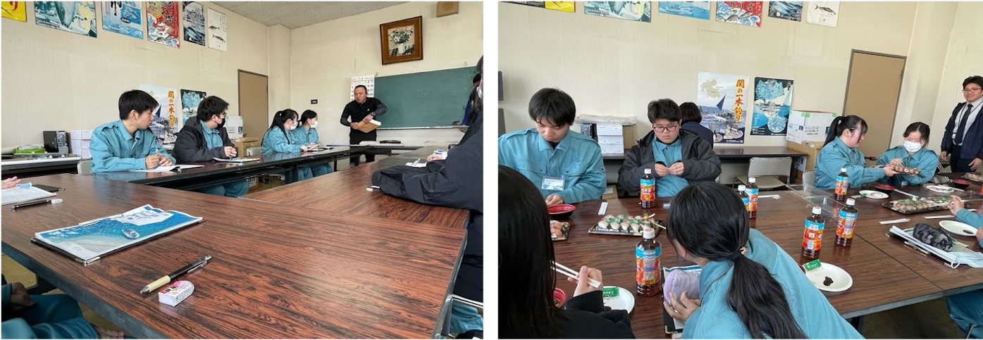 続いて大分県漁業協同組合佐賀関支店にて佐藤支店長と同校のOBである職員の須川さんからお話を伺いました。今回は進路選択を控えた2年生がメインの参加ということもあり、将来のキャリアを具体的にイメージできる貴重な時間となりました。お昼は須川さんの神経締めしたお魚でお寿司をいただき「今まで食べたものと全然違う!」と感激し、技術の価値を実感する特別な体験となりました。また、この日はクロメ漁の解禁日ということもあり、今でしか見られない貴重なクロメ漁の見学もさせていただきました。