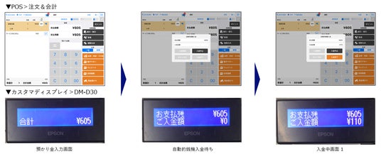 自動釣銭機への入金金額がカスタマディスプレイに表示されるようになりました。これにより、会計での現金支払時やハウスマネーチャージ時に入金額が表示されます。また、カスタマディスプレイをiPod TouchやTWC-16040Lで利用する場合も、同様に入金額が表示されます。