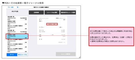 伝票合算を行った際、精算レシートや日報データの未会計消込に計上されなくなりました。本改修により、売上登録ジャーナルに「取消明細.取消明細区分」が追加されます。なお、通常の伝票消込においては変更はありません。