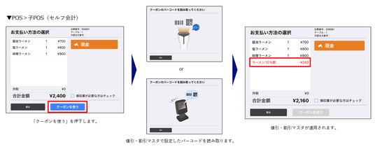 セルフ会計POSで値引き・割引バーコードを利用した会計ができるようになりました。個別会計を行った場合、会計ごとに値引き・割引バーコードをご利用いただけます。