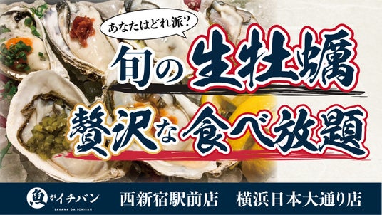 豊洲市場から直送される鮮魚介を提供する海鮮処「魚がイチバン」で、旬の生牡蠣を心ゆくまで堪能できる「生牡蠣食べ放題プラン」を、横浜日本大通り店および西新宿駅前店の2店舗限定で開始いたします。