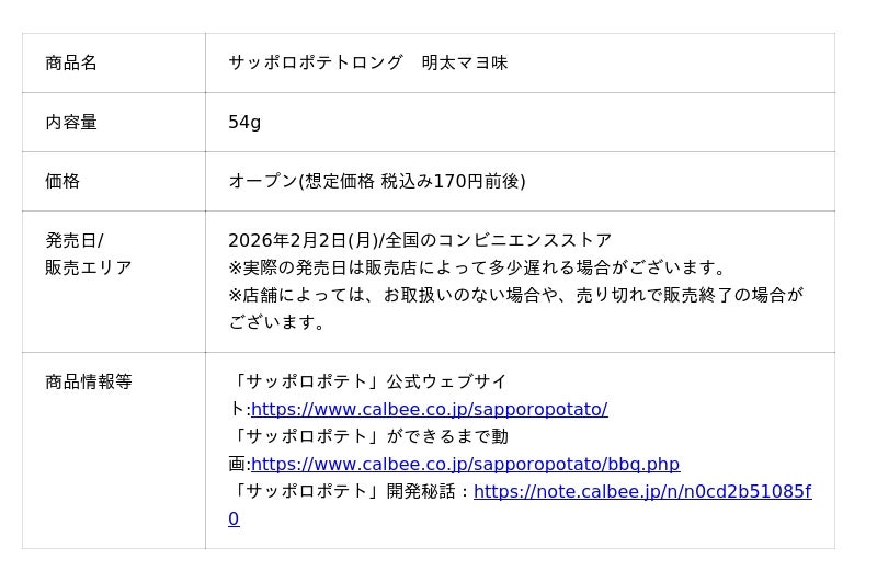 カルビー株式会社(本社:東京都千代田区、代表取締役社長兼CEO: 江原 信)は、「まるでフライドポテト」のような「サッポロポテトロング」ブランドより、新商品『サッポロポテトロング 明太マヨ味』を、2026年2月2日(月)から全国のコンビニエンスストアで期間限定発売します(2026年3月上旬終売予定)。