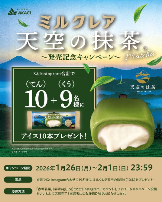 また、皆さまに喜んでいただける企画として、2026年1月26日(月)より「ミルクレア天空の抹茶(R)」が当たるキャンペーンを赤城乳業の公式X、公式Instagramで開始いたします。