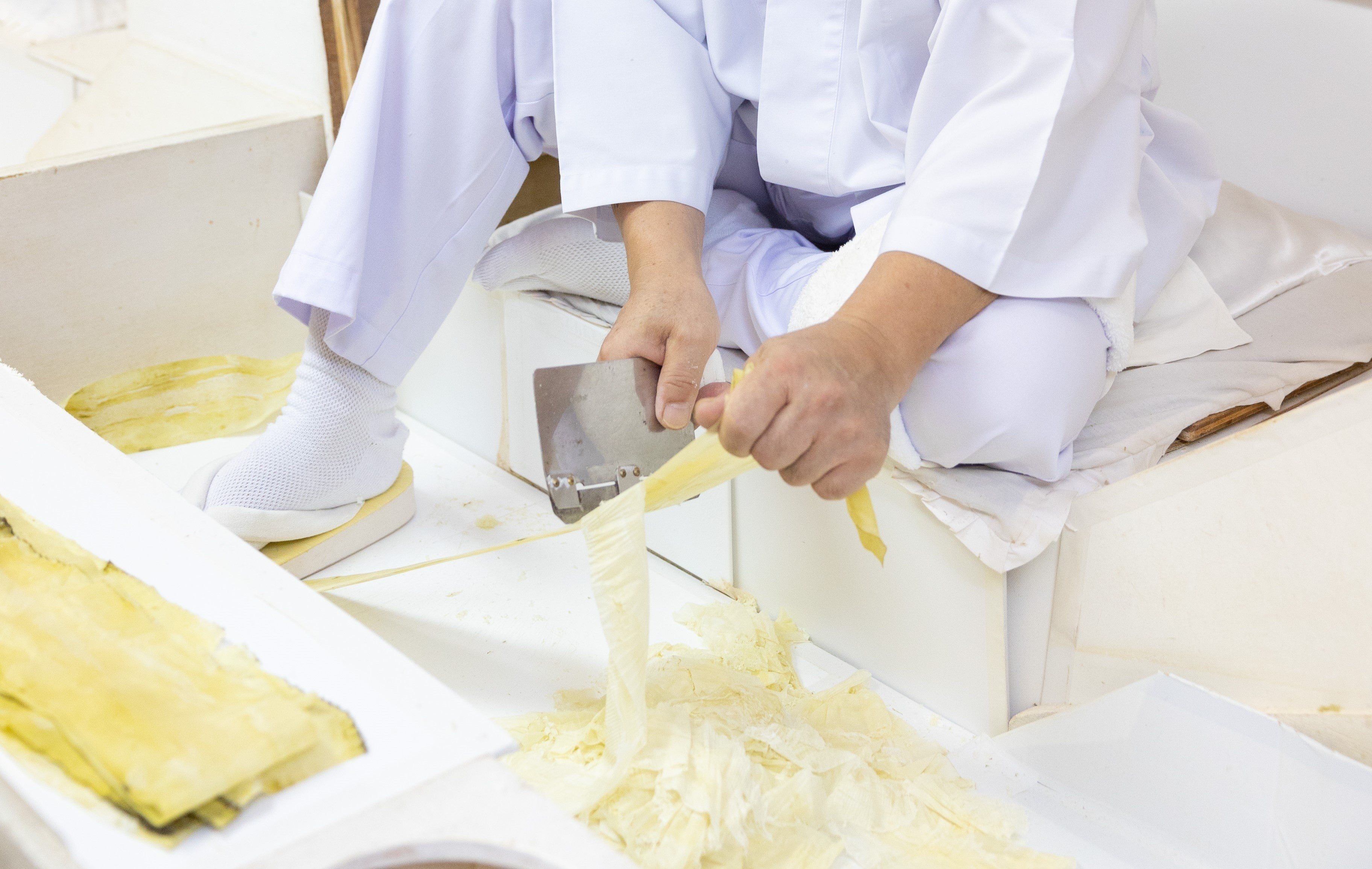 【おぼろ昆布手すき体験】敦賀が生産量日本一を誇る「おぼろ昆布」。機械化が困難のため、現在も職人が手作業で削り、生産しています。醸造酢に漬けて柔らかくした昆布の表面を専用の包丁で薄く削り出す工程を体験いただけます。開催日時:2026年2月14日(土)・2月15日(日)