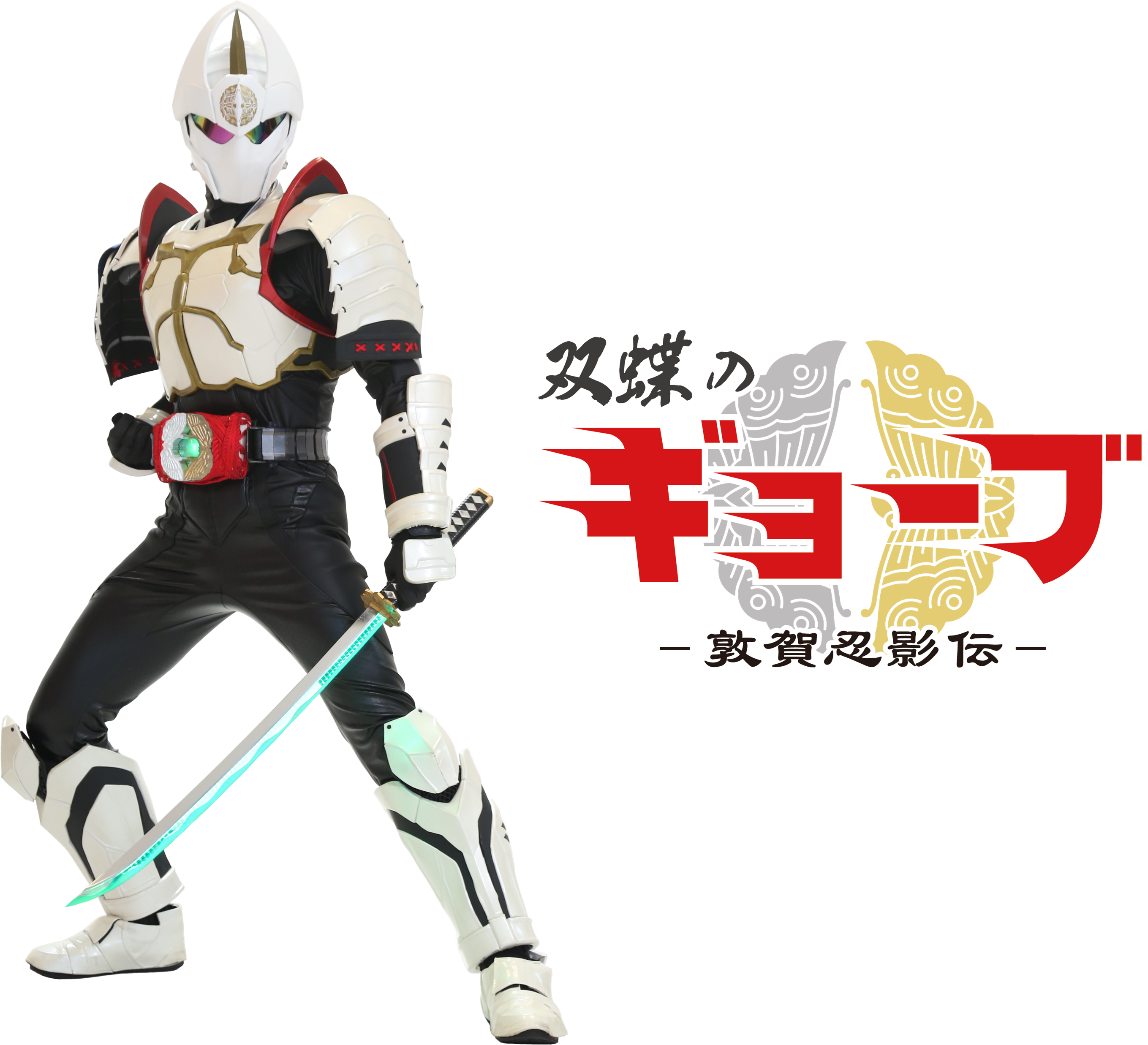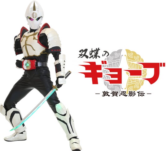 【双蝶のギョーブ・敦賀城主大谷吉継おもてなし武将隊 大谷吉継 グリーティング】敦賀城の城主として知られる大谷吉継がモチーフのご当地ヒーロー「双蝶のギョーブ」と大谷吉継おもてなし武将隊「大谷吉継」と写真撮影ができます。