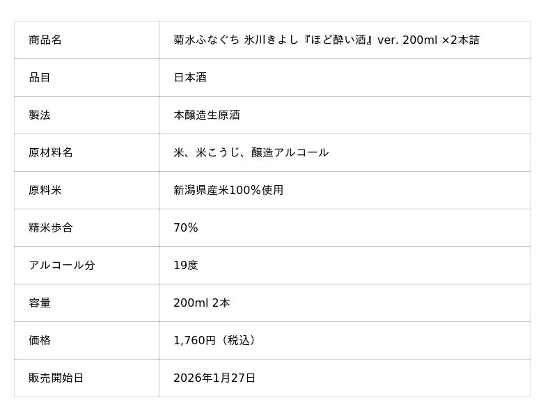 菊水酒造株式会社(所在地:新潟県新発田市島潟750、代表取締役:高澤大介)は、2026年1月27日より、「菊水ふなぐち 氷川きよし『ほど酔い酒』ver. 200ml×2本詰」を発売いたします。