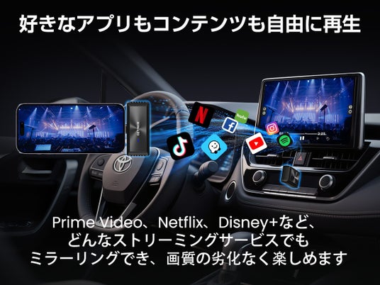 サービスエリアでの休憩や、お迎え待ち、駐車中のひと息タイムに。YouTube、ライブ配信、スポーツ、Webページ、写真・動画など、スマホで見ている画面を車内モニターへワイヤレス表示できます。停車中の“ちょい視聴”や同乗者との共有がスムーズになります。