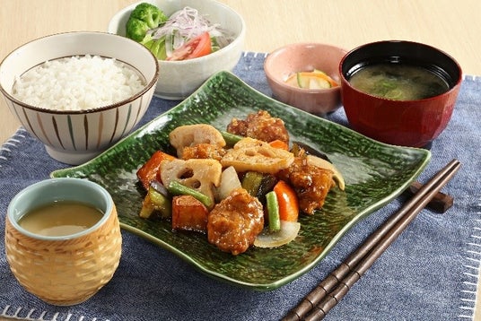 不動の人気NO.1メニュー!玄米黒酢と黒糖に、りんご酢で味を調えた、大戸屋オリジナルの黒酢あん。ごろっと大きな野菜とお肉で大満足の一品です。