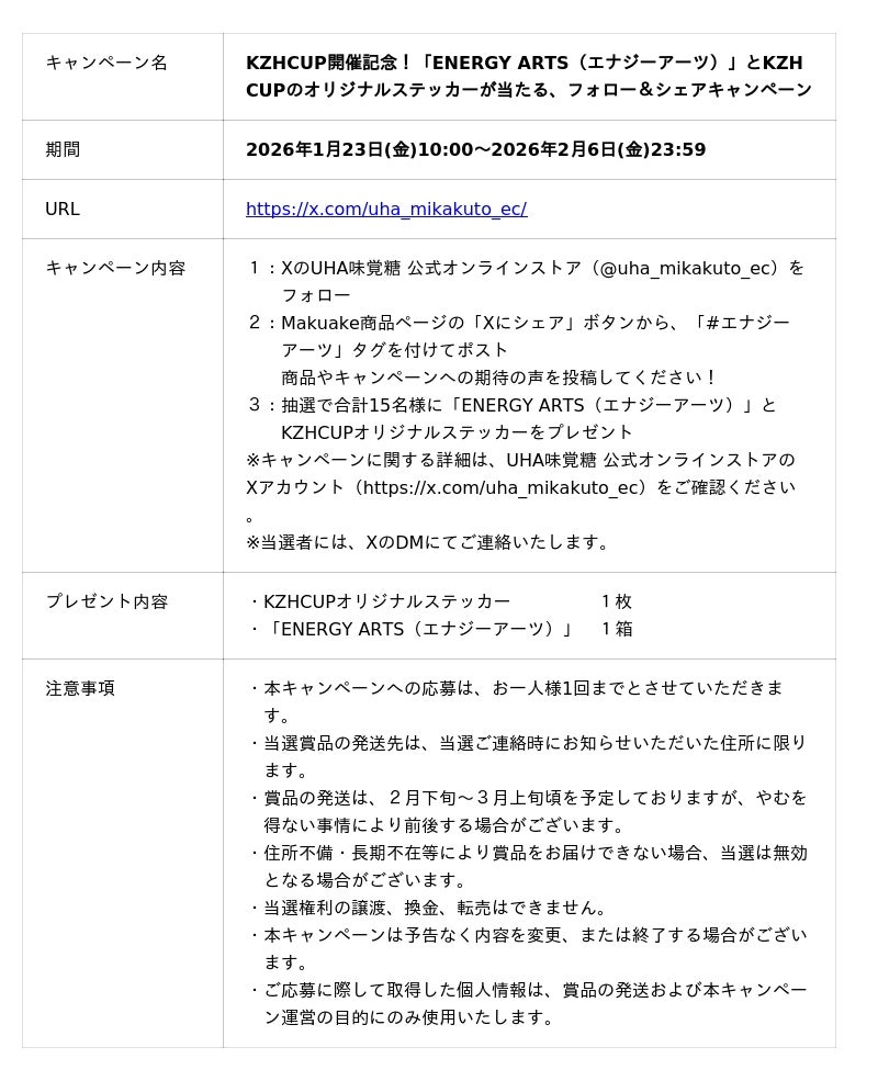 XのUHA味覚糖公式オンラインストア(@uha_mikakuto_ec)をフォロー&Makuake商品ページから「#エナジーアーツ」を付けてXシェアをしてくれた方の中から、