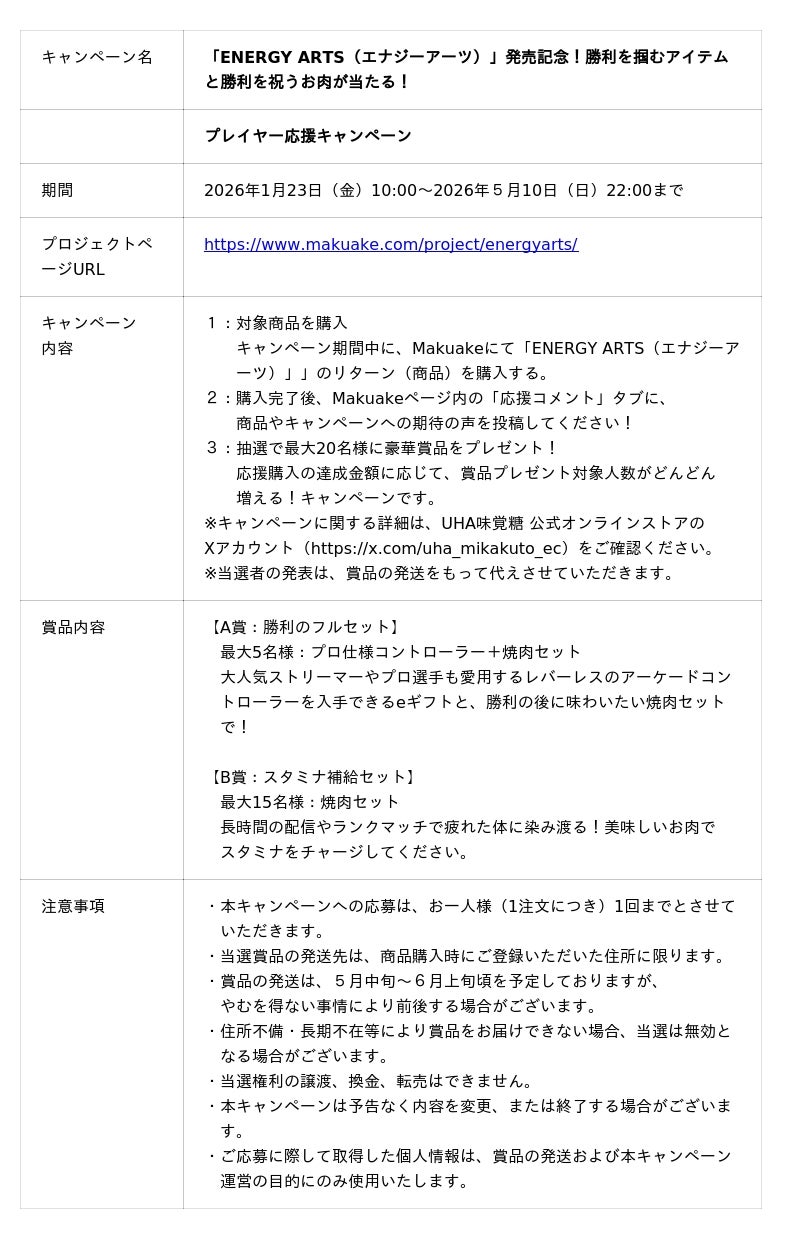 「ENERGY ARTS(エナジーアーツ)」発売記念!勝利を掴むアイテムと勝利を祝うお肉が当たる!プレイヤー応援キャンペーン