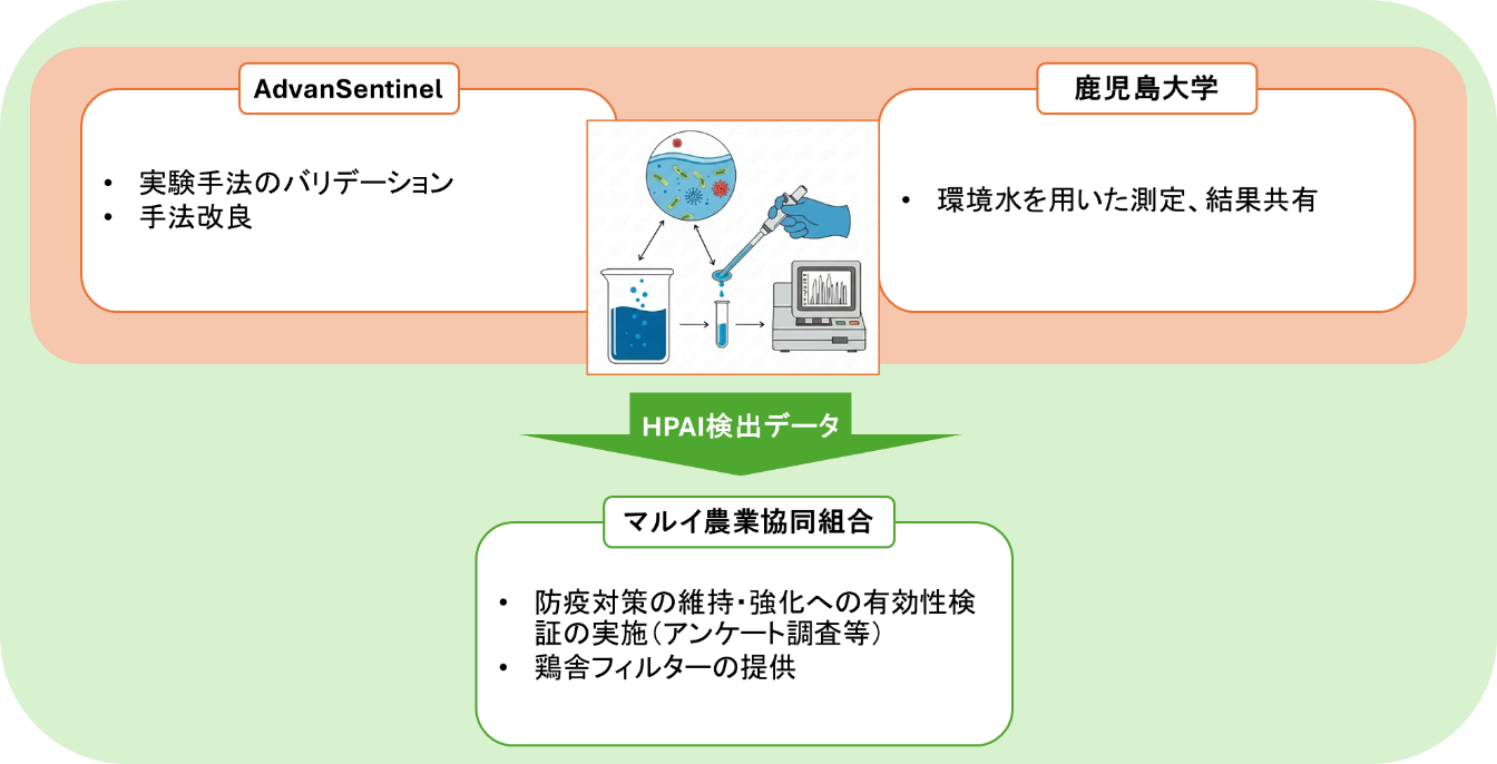 株式会社 AdvanSentinel(本社:大阪市、代表取締役社長:西田 都、以下 AdvanSentinel)、 国立大学法人鹿児島大学(大学長:井戸 章雄、以下鹿児島大学)およびマルイ農業協同組合 (鹿児島県出水市、代表理事組合長:高松 信吾、以下マルイ農協)は、渡り鳥が飛来した湖 沼水からの高病原性鳥インフルエンザウイルス(以下 HPAI ウイルス)の検出が養鶏場にお ける防疫に与える有用性についての共同研究を開始しました。
