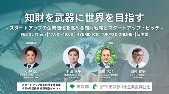 また、イベント後半では、東京都「スタートアップ知的財産支援事業」に採択され、知財を武器に世界に挑戦するスタートアップ3社によるピッチを開催するとともに、現地会場では、登壇スタートアップと参加者同士の交流・協業等を促進するネットワーキングも行います。