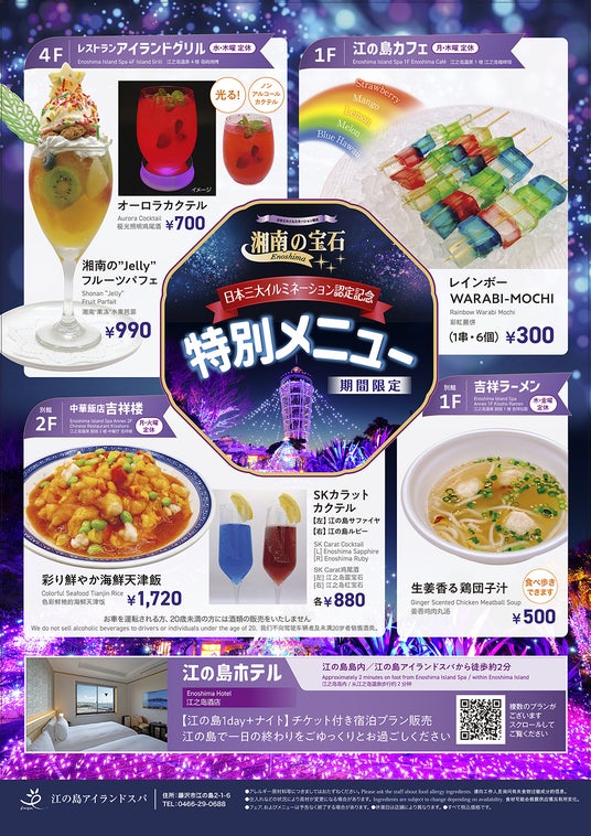 株式会社 飯田産業(本社:東京都武蔵野市、代表取締役社長 築地 重彦)が運営する『江の島アイランドスパ』は、江の島・片瀬海岸一帯で毎年実施されているイルミネーション「湘南の宝石」が(一社)夜景観光コンベンション・ビューロー(代表理事:丸々もとお)により「日本三大イルミネーション」の1つに認定されたことを記念し、館内の飲食4店舗で期間限定の「イルミネーションにちなんだメニュー」を販売いたします。あわせて島内徒歩2分に立地する『江の島ホテル』は江の島のイルミネーションを堪能できる1dayチケットが付いた限定の宿泊プランを販売します。島全体が光と色に包まれた江の島で、ゆったりと贅沢な時間をお得にお過ごしいただけます。