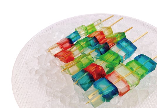 いちご、マンゴー、レモン、メロン、ブルーハワイ風味の小さなわらび餅を食べやすく串にさした、見た目も楽しい1本。