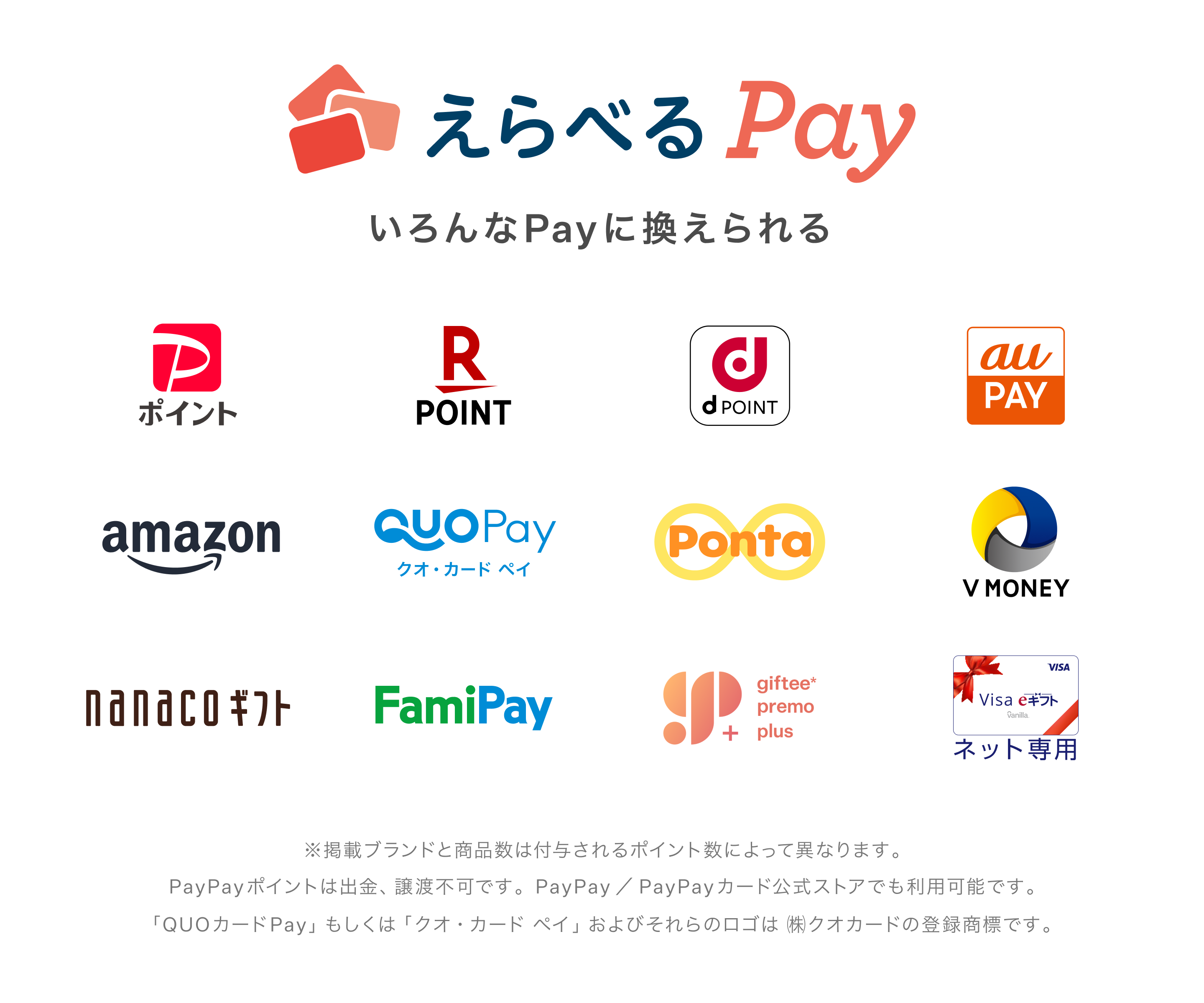 「えらべるPay(R)?」は、株式会社ギフティが提供するデジタルギフトであり、さまざまなスマホ決済サービスポイントの中から贈呈された「ギフトポイント」内でお好きな商品と交換することができます。「えらべるPay(R)?」および「ギフトポイント」の利用には会員登録やアプリダウンロードの必要もなく、保有ポイント内で複数の決済サービスポイントを選ぶことも可能です。