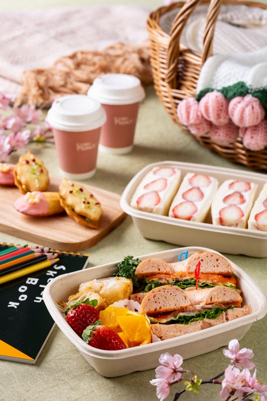 ピクニックセットには、滋賀県産のいちごとクリームを挟んだ見た目も華やかないちごのサンドウィッチや、特産品の“えび豆”と“赤こんにゃく”を生地に練りこんだベーグルサンドなど、近江の恵みを感じるメニューをご用意し、束ねて手に持つと花束のようになる可愛いブランケットや、思い出を形に残すアートセットをはじめとしたフォトジェニックなアイテムも貸出いたします。