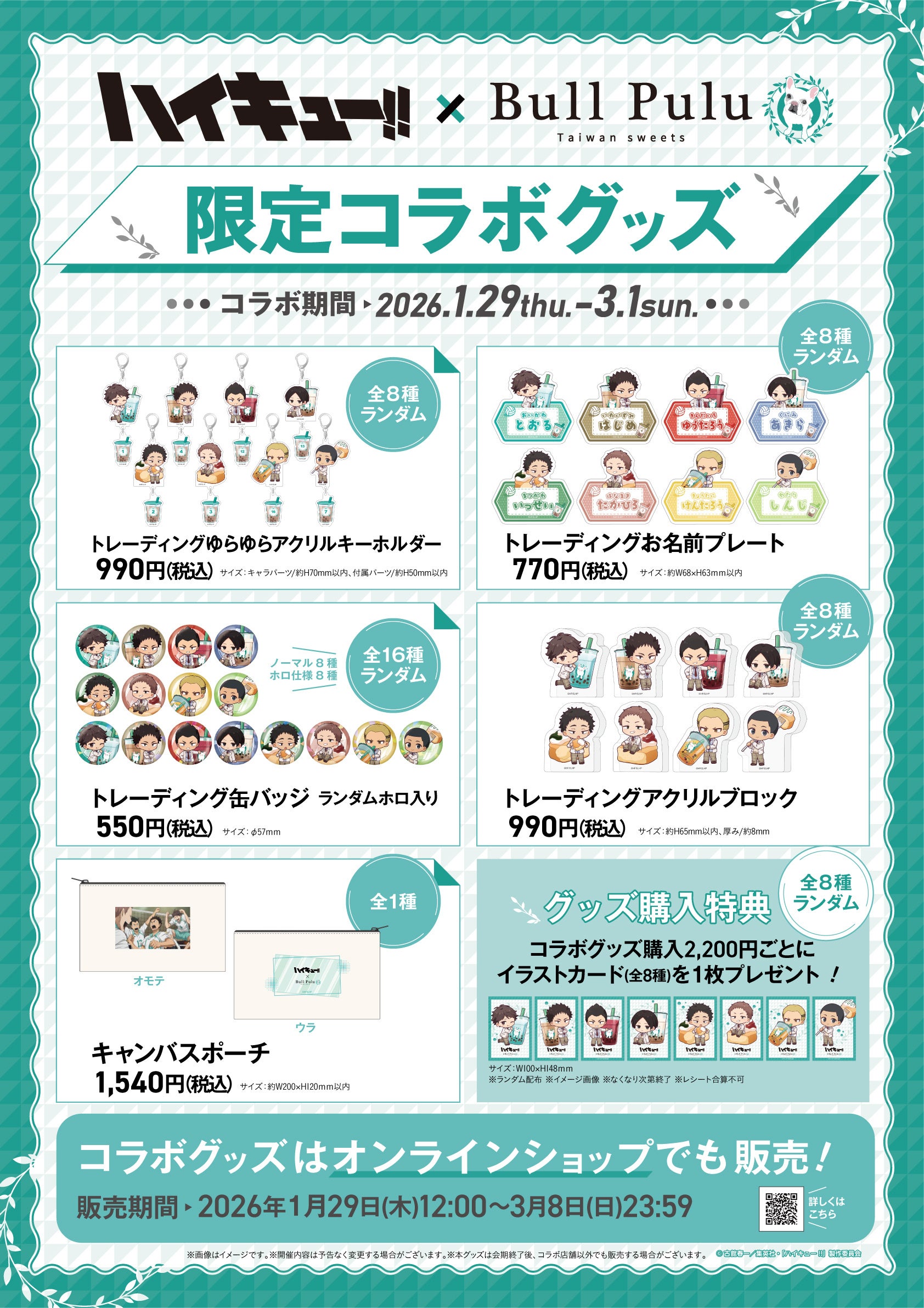 限定コラボグッズは、青葉城西高校のメンバーたちが、タピオカや台湾カステラを楽しんでいる姿のグッズがたくさん!
