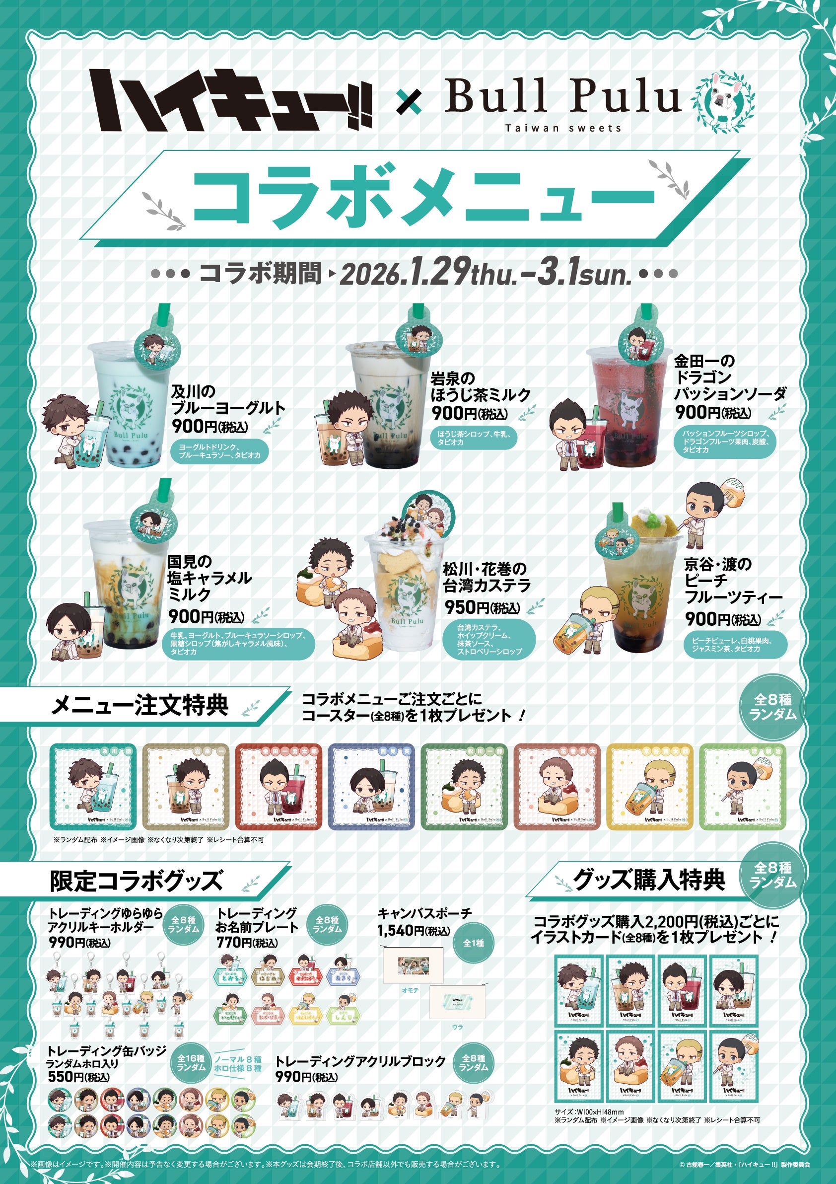 株式会社Bull Pulu(本社:東京都豊島区、代表取締役会長:加藤 二朗 代表取締役社長:忠岡 鴻謹)は、2026年1月29日(木)よりタピオカドリンクのお店「Bull Pulu」各店舗にて、人気アニメ「ハイキュー!!」とのコラボキャンペーンを開催いたします。