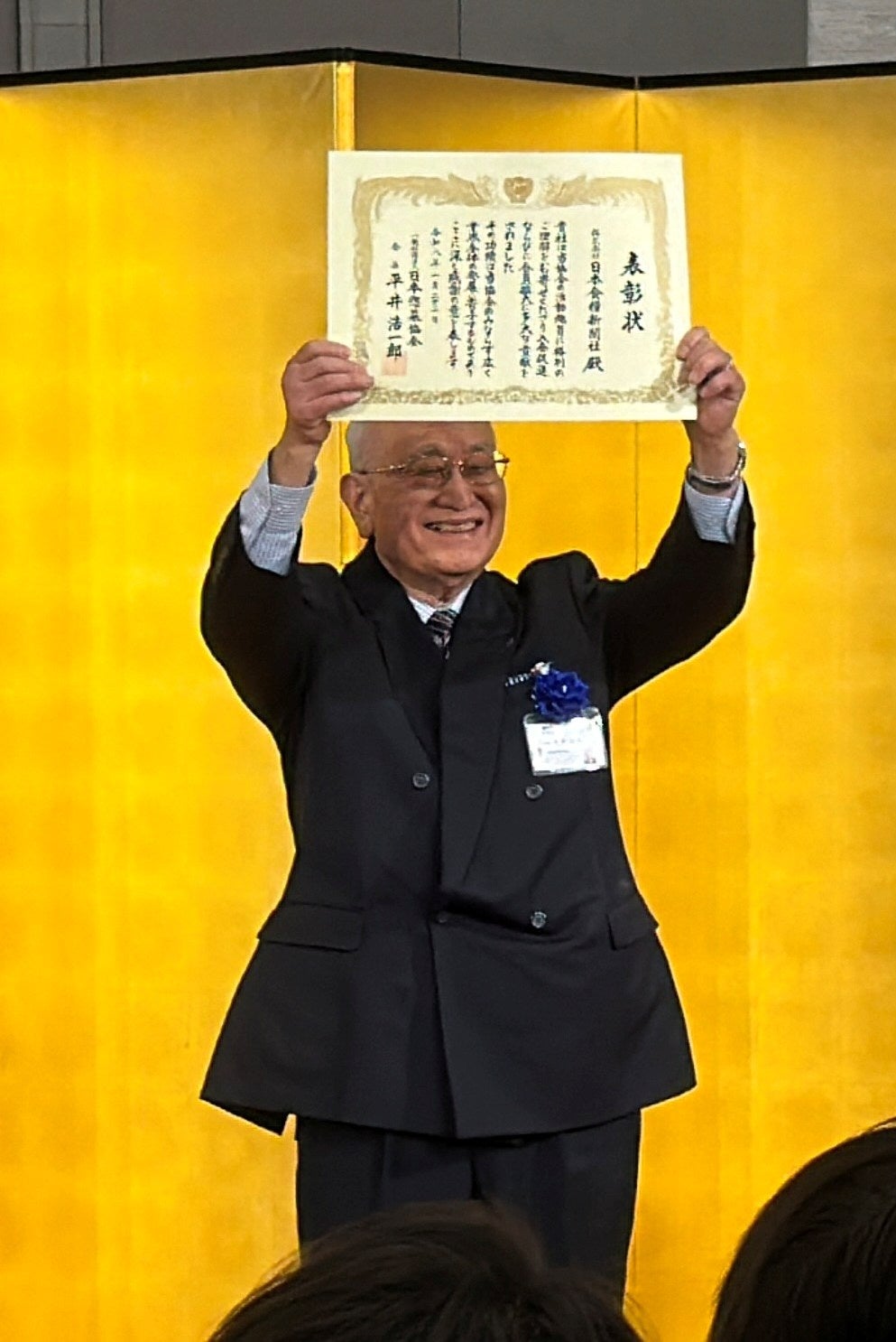 贈呈式は懇親会の中で執り行われ、日本惣菜協会の平井浩一郎会長より当社名誉会長・今野正義が代表して表彰状を拝受いたしました。協会活動への理解と支援、中食産業全体の発展への貢献が評価されたものです。当日は業界関係者780名が出席し、会場から大きな拍手が送られました。