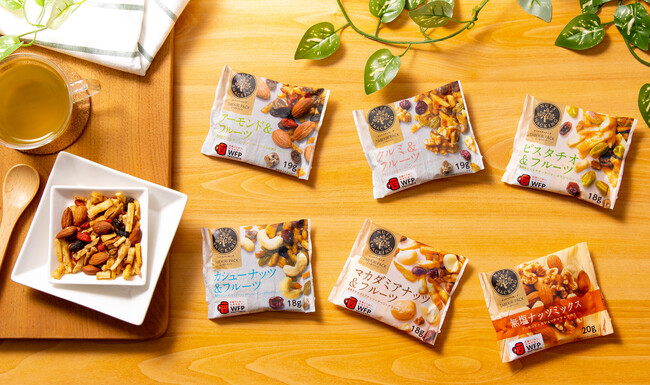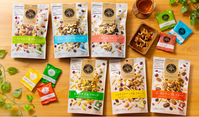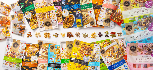 ナッツスナッキングシリーズとは、ナッツと食べ合わせの良いドライフルーツを混合し、素材のおいしさを活かした体に優しい健康応援のおやつです。食べきりやすく持ち運びしやすい“個包装タイプ”であることが特徴です。27種類と豊富なラインナップで、日々の習慣にしていただきやすいシリーズとなっております。