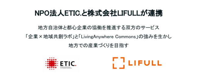 NPO法人ETIC.(エティック、東京都渋谷区)は、このたび株式会社LIFULL(ライフル、東京都千代田区)と連携し、地方自治体をフィールドにした新規事業開発をめざす都心企業を両社の連携自治体に誘致する取り組みを協働で実施します。