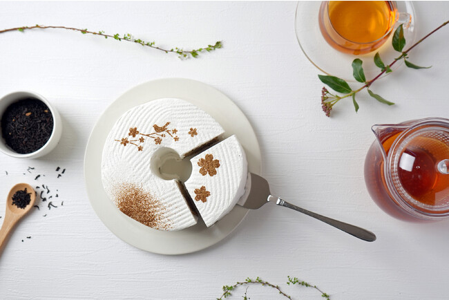 九州産生クリームと国産マスカルポーネを使用したコクのあるクリームでシフォンを包み込み、天面には紅茶パウダーで初春をイメージしたデザインをあしらいました。