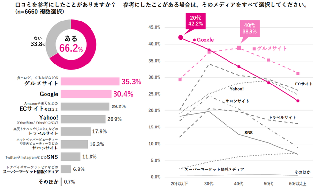 年代別で見てみると、40・50・60代のトップは「食べログ、ぐるなびなどのグルメサイト」、20代のトップは「Google」(42.2%)という結果でした。20代は他の世代と比較して「Google」を参考にするという人が特に多くなっています。