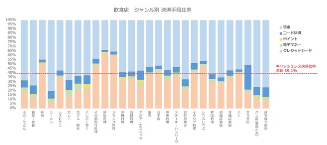 集計内容:飲食店 ジャンル別 キャッシュレス決済方法比率、キャッシュレス決済比率(内訳)