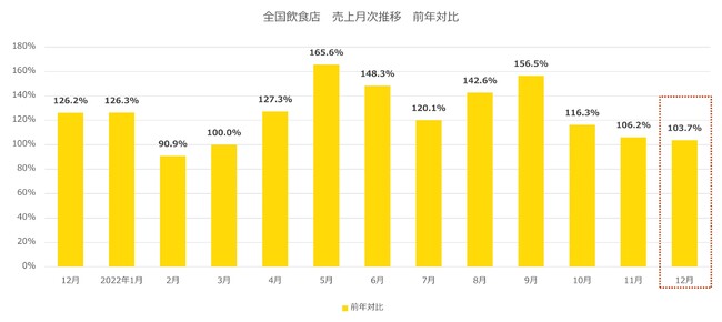 ■12月度売上の前年対比は前月からマイナス。第8波の影響をうけつつも下がり幅は緩やか。
