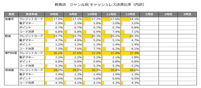 ・11月度→12月度比較すると、クレジットカード比率は居酒屋で-1.8ptであったが他の業態は横ばいを維持。