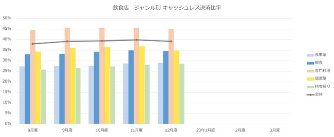 11月度→12月度で飲食店全ジャンルのキャッシュレス決済比率の推移は98% (39.8%→39.1%)。食事系以外の全ジャンルで前月から微減した。特に居酒屋は-2.0ptで34.7%。