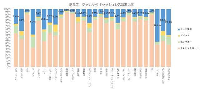 クレジットカードが決済比率を占める。現金決済比率が大きいラーメン、パン屋、持ち帰り販売などの業態はコード決済比率が高い。