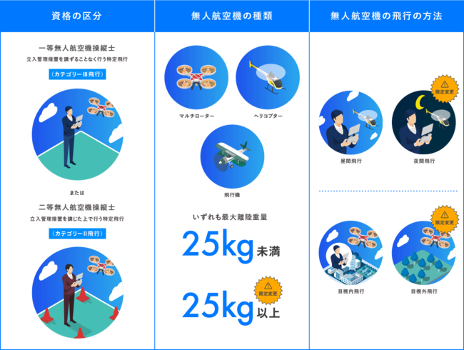 資格の区分としては、「一等」、「二等」という区分のほか、「マルチローター」・「ヘリコプター」・「飛行機」の3種類。また限定変更として、「夜間飛行」、「目視外飛行」、「25Kg以上の機体」を限定解除するか否かの選択が可能です。